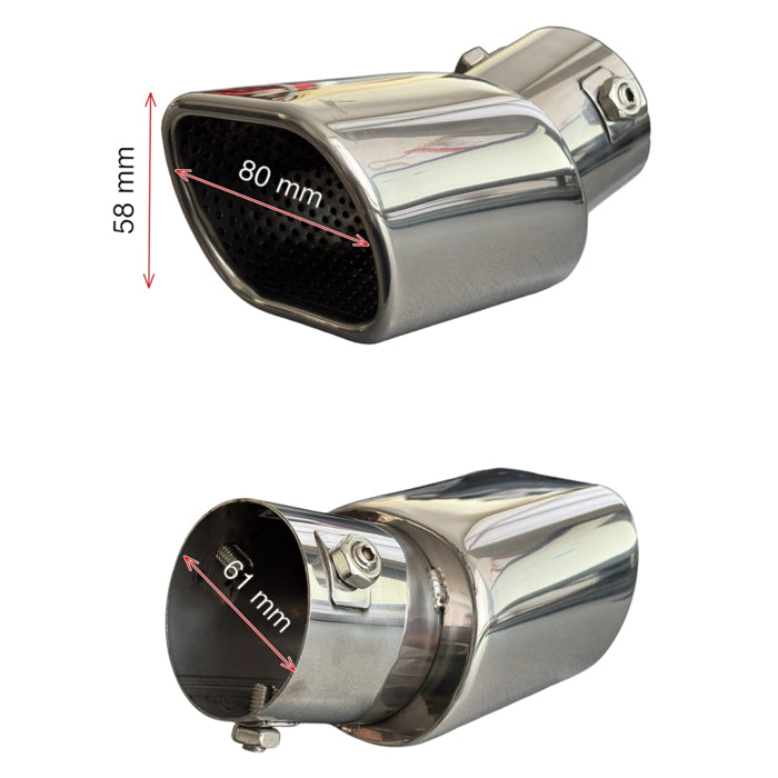 Този накрайник за ауспух е изработен от висококачествен никелиран метал, осигуряващ здравина и издръжливост. С лесен монтаж чрез скоби, той придава спортен и стилен вид на автомобила.